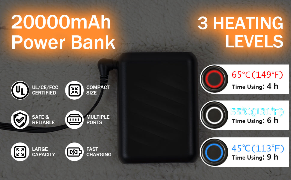 - Long battery life: Up to 10 hours on low heat setting from the 20,000mAh power bank